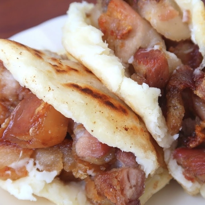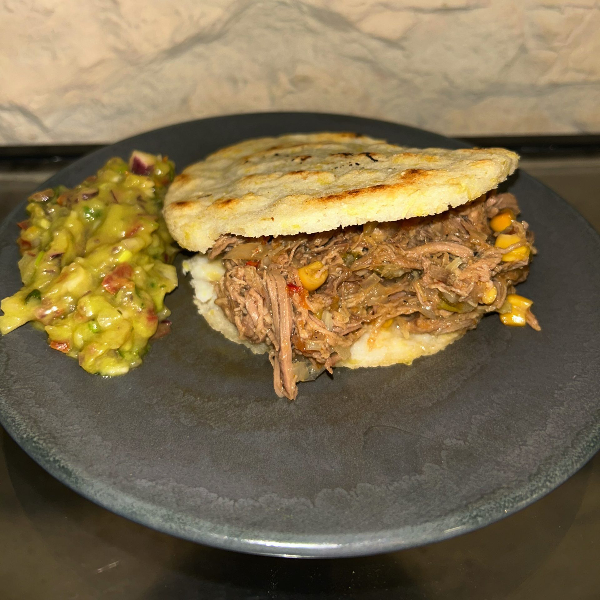 Carne de ternera y pollo desmechado, guiso de la casa, queso gratinado, aguacate y maíz dulce. Con opción de 3 carnes: ternera, pollo y chicharrón.