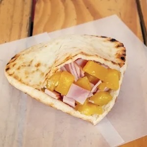 Queso gratinado, piña y jamón york